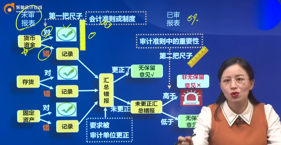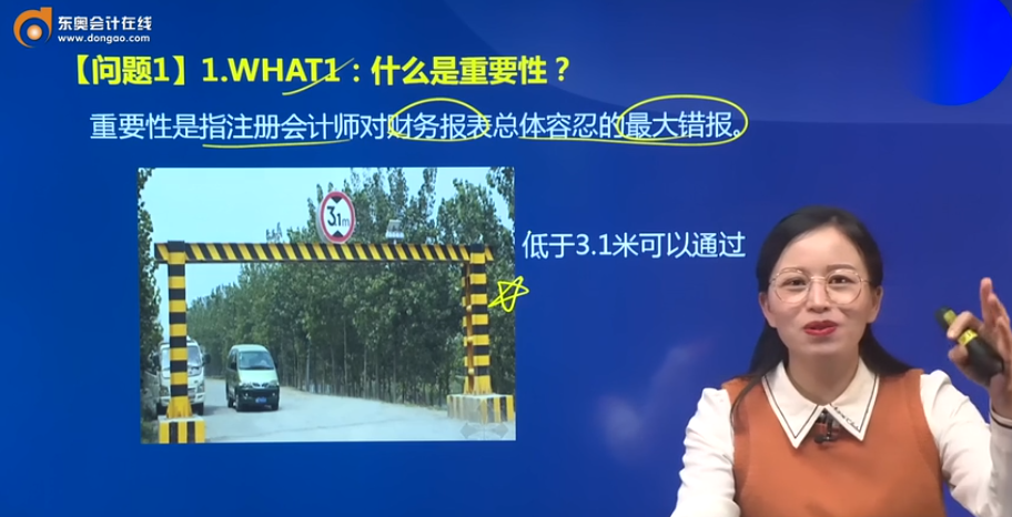 “我通過這張圖,為大家講解一下重要性的定義,就好比這個限高欄,低于3.1米的汽車都是可以通過的,這個高度就相當于注冊會計師對財務報表總體容忍的最大錯報。”通過這種形象的圖片比喻,凌紫綺老師幫學員們通過一個又一個阻礙,扎實記憶,高效備考。
