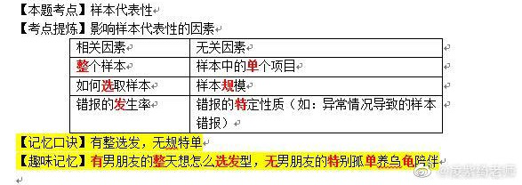 影響樣本代表性的因素由“相關因素”與“無關因素”組成,共有6個具體內容。凌紫綺老師先是提煉出記憶口訣:有整選發(fā),無規(guī)特單。再通過趣味記憶法,將口訣擴展成一個更易于記憶的句子——“有男朋友的整天想怎么選發(fā)型,無男朋友的特別孤單養(yǎng)烏龜陪伴?!蓖ㄟ^口訣記憶和趣味記憶,學員普遍表示:“這要是再不記住知識點,就太說不過去了。”