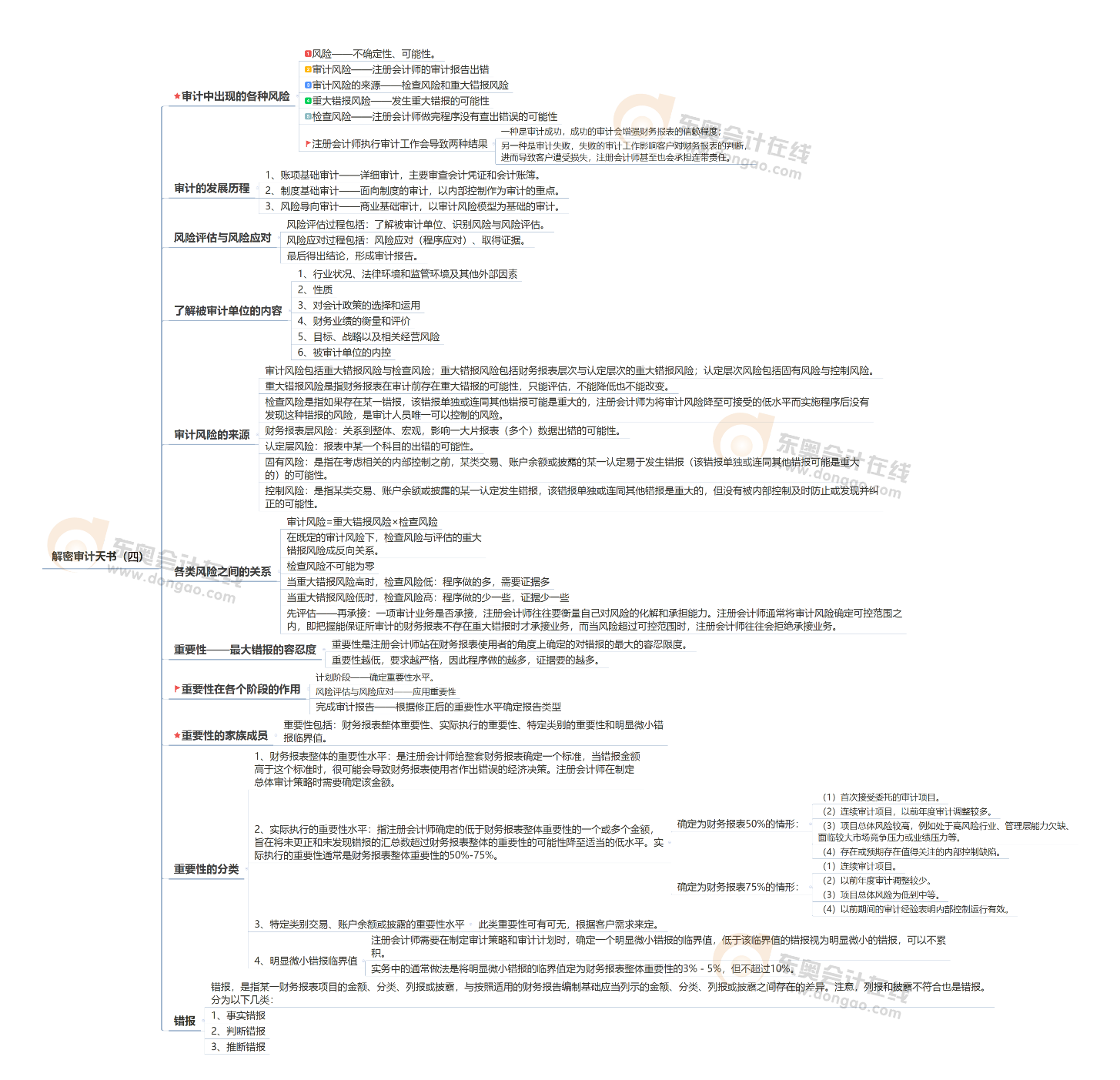 審計(jì)風(fēng)險(xiǎn)包括重大錯(cuò)報(bào)風(fēng)險(xiǎn)與檢查風(fēng)險(xiǎn);重大錯(cuò)報(bào)風(fēng)險(xiǎn)包括財(cái)務(wù)報(bào)表層次與認(rèn)定層次的重大錯(cuò)報(bào)風(fēng)險(xiǎn);認(rèn)定層次風(fēng)險(xiǎn)包括固有風(fēng)險(xiǎn)與控制風(fēng)險(xiǎn)。