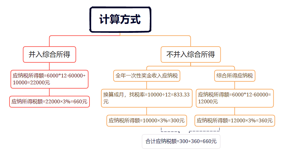對(duì)于工資和獎(jiǎng)金收入都不高的員工A來(lái)說(shuō),并入綜合所得和不并入綜合所得單獨(dú)計(jì)稅沒(méi)有區(qū)別,兩種計(jì)算方式最終的結(jié)果是一樣的。
