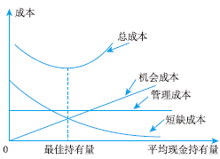 利用成本分析模式控制現(xiàn)金持有量時(shí),現(xiàn)金相關(guān)總成本隨著持有量的變化而變化,如右圖所示: