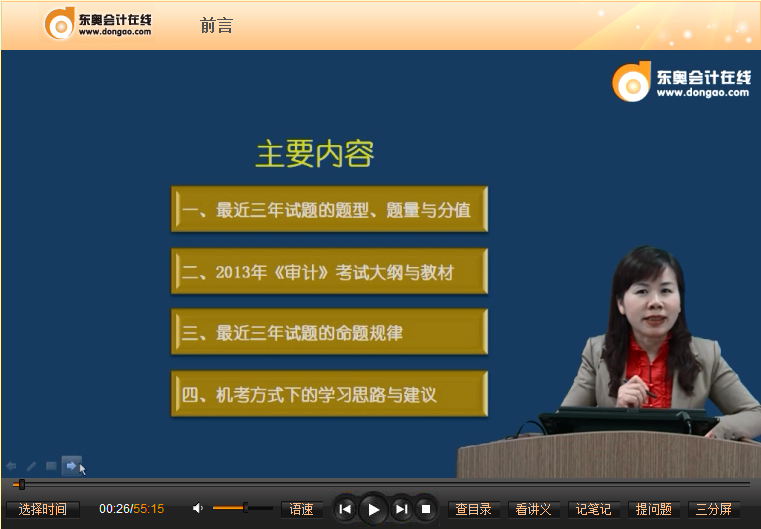【東奧小編】2013年注冊會計(jì)師考試報名時間已截止,新一輪復(fù)習(xí)已拉開序幕,東奧注會六門科目基礎(chǔ)班課程已開通,目前已陸續(xù)更新,基礎(chǔ)班是最核心的課程,匯聚業(yè)界頂級名師,每位名師主講自己最擅長、把握最精準(zhǔn)的課程。讓考生一步一個腳印牢牢掌握每一個考點(diǎn)。以下是東奧名師劉圣妮2013年注冊會計(jì)師考試基礎(chǔ)班免費(fèi)課件:《審計(jì)》之給初學(xué)審計(jì)的考生的一些建議。