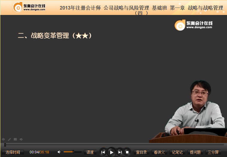 【東奧小編】2013年注冊會計師考試新一輪復習已拉開序幕,東奧注會六門科目基礎班課程已開通,目前已陸續(xù)更新,基礎班是最核心的課程,匯聚業(yè)界頂級名師,每位名師主講自己最擅長、把握最精準的課程。讓考生一步一個腳印牢牢掌握每一個考點。以下是東奧名師田明2013年注冊會計師考試基礎班免費課件:《公司戰(zhàn)略與風險管理》之戰(zhàn)略變革管理。