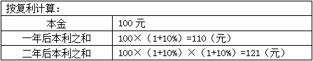 【例題】銀行存款利率是10%,現(xiàn)在存入人民幣100元,要求:2年后能夠從銀行取出多少錢?(分別按單利計(jì)息和復(fù)利計(jì)息計(jì)算)