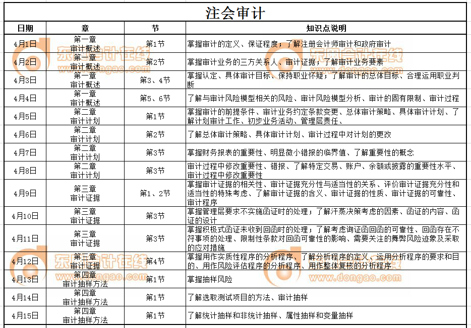 2019年注冊會(huì)計(jì)師4月《審計(jì)》科目每日學(xué)習(xí)計(jì)劃