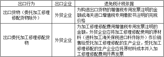 出口貨物勞務及應稅服務的增值稅退(免)稅的計稅依據(jù),按出口貨物勞務及應稅服務的出口發(fā)票(外銷發(fā)票)、其他普通發(fā)票或購進出口貨物、勞務及應稅服務的增值稅專用發(fā)票、海關進口增值稅專用繳款書確定。