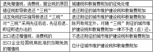 (2)對因減免稅而需進(jìn)行“三稅”退庫的,城建稅也同時退庫。但是對出口產(chǎn)品退還增值稅、消費(fèi)稅的,不退還已繳納的城建稅;對“三稅”實(shí)行先征后返、先征后退、即征即退辦法的,除另有規(guī)定外,對隨“三稅”附征的城市維護(hù)建設(shè)稅和教育費(fèi)附加,一律不予退(返)還。