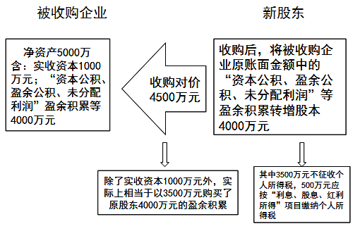 1名或多名個(gè)人投資者以股權(quán)收購(gòu)方式取得被收購(gòu)企業(yè)股權(quán),股權(quán)收購(gòu)前,被收購(gòu)企業(yè)原賬面金額中的“資本公積、盈余公積、未分配利潤(rùn)”等盈余積累未轉(zhuǎn)增股本,而在股權(quán)交易時(shí)將其一并計(jì)入股權(quán)轉(zhuǎn)讓價(jià)格并履行了所得稅納稅義務(wù)。股權(quán)收購(gòu)后,企業(yè)將原賬面金額中的盈余積累向個(gè)人投資者(新股東,下同)轉(zhuǎn)增股本,有關(guān)個(gè)人所得稅問(wèn)題區(qū)分以下情形處理: