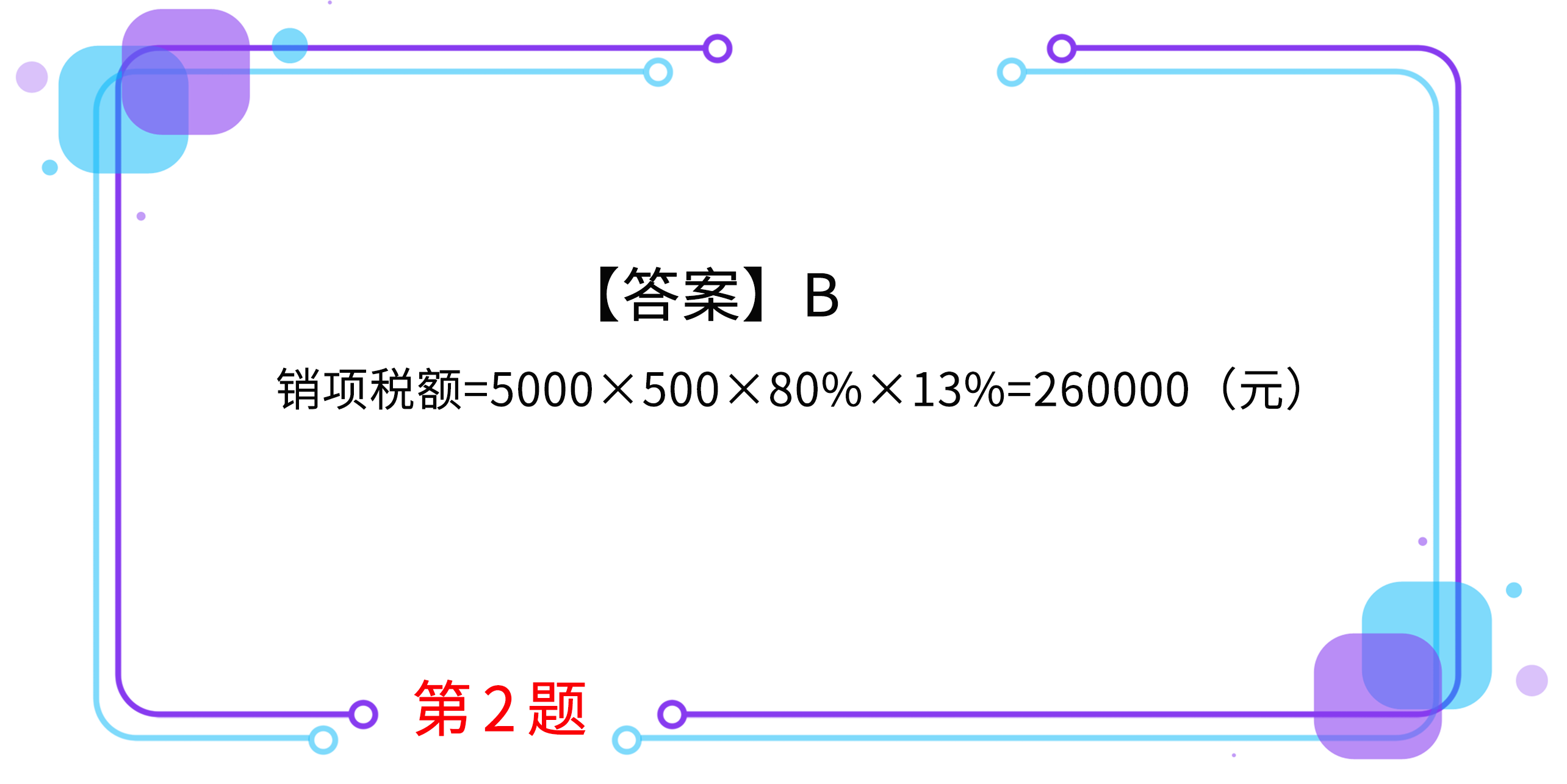2.甲企業(yè)(一般納稅人)銷售給乙公司5000套服裝,每套不含稅價格為500元,由于乙公司購買數(shù)量多,甲企業(yè)按原價的8折優(yōu)惠銷售(折扣額與銷售額在同一張發(fā)票的金額欄中分別注明)。乙公司于10日付款,則甲企業(yè)此項業(yè)務(wù)的銷項稅額為( )。
