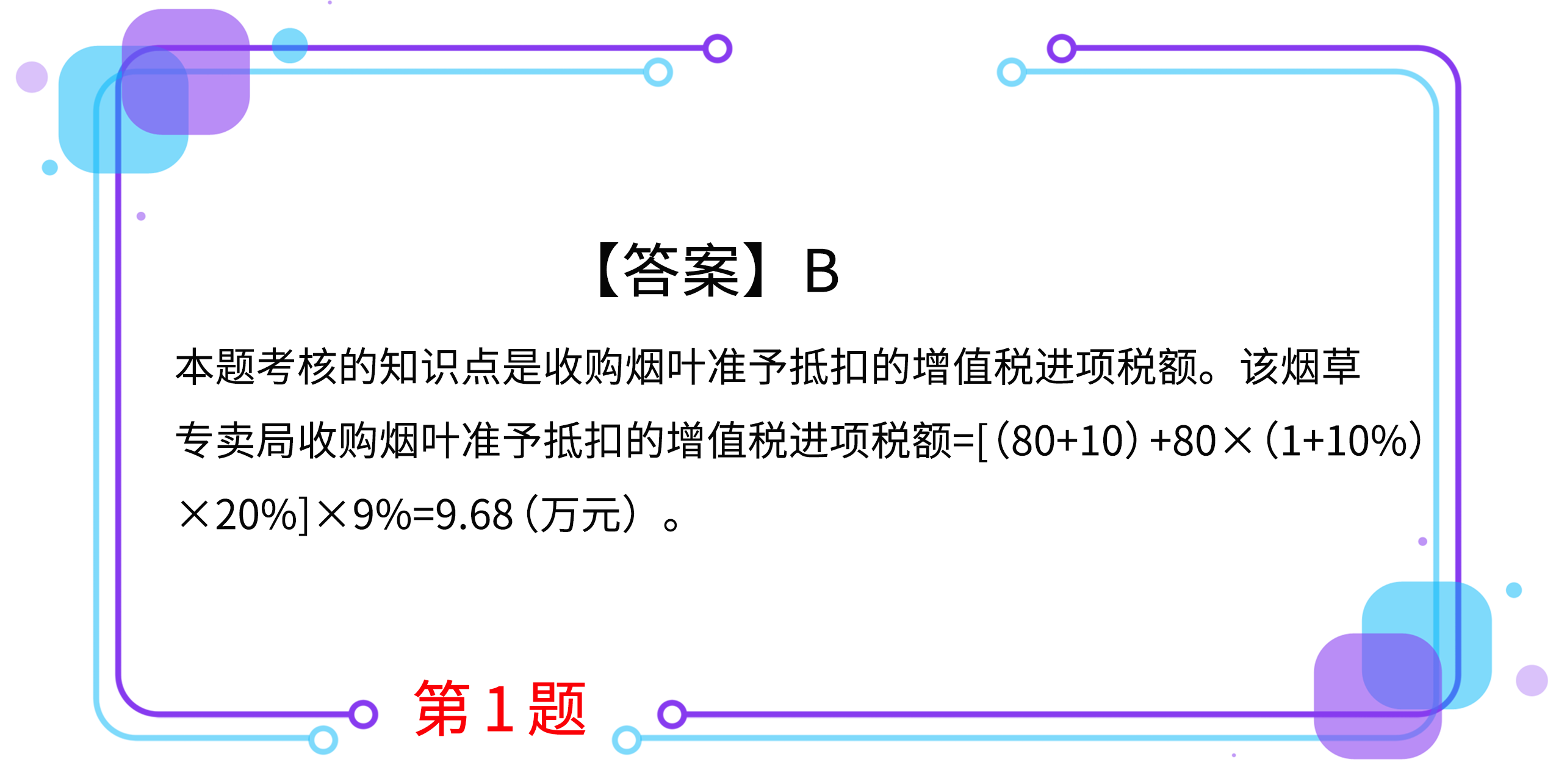 1.某煙草專賣局系增值稅一般納稅人,2020年3月向農(nóng)民收購煙葉,收購憑證上注明收購價款80萬元,并向煙葉生產(chǎn)者支付了價外補貼10萬元。該納稅人3月份收購煙葉可抵扣的進項稅額為(      )。