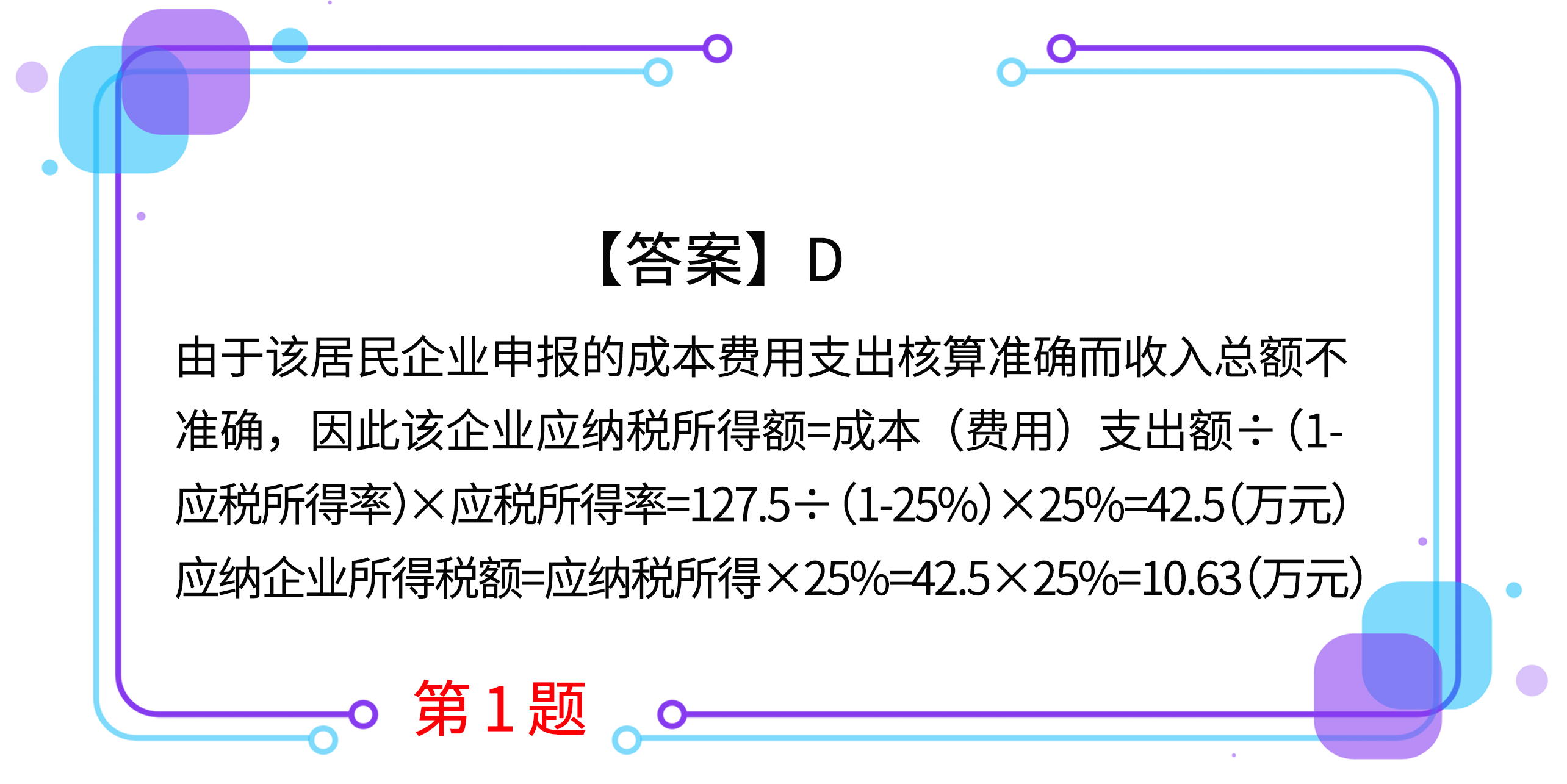1.2019年某居民企業(yè)向稅務(wù)機(jī)關(guān)申報(bào)收入總額120萬元,成本費(fèi)用支出總額127.5萬元,全年虧損7.5萬元,經(jīng)稅務(wù)機(jī)關(guān)檢查,成本費(fèi)用支出核算準(zhǔn)確,但收入總額不能確定。稅務(wù)機(jī)關(guān)對(duì)該企業(yè)采取核定征收辦法,應(yīng)稅所得率為25%。2019年度該企業(yè)應(yīng)繳納企業(yè)所得稅(     )萬元。
