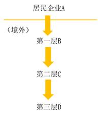 第三層:單一第二層外國企業(yè)C直接持有D20%以上股份,且由單一居民企業(yè)A直接持有D20%以上股份;或通過一個或多個符合規(guī)定持股條件的外國企業(yè)BC間接持有D總和達(dá)到20%以上股份。即:AB≥20%,BC≥20%,CD≥20%且:AD≥20%或AB*BC*CD≥20%
