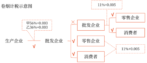 1.復(fù)合計(jì)稅——卷煙批發(fā)環(huán)節(jié)的稅率為11%的比例稅率加0.005元/支的定額稅率;