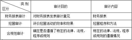 注冊(cè)會(huì)計(jì)師審計(jì)是一種有償?shù)奈袑徲?jì),按照接受委托目的和內(nèi)容,注冊(cè)會(huì)計(jì)師審計(jì)可分為財(cái)務(wù)報(bào)表審計(jì)、經(jīng)營(yíng)審計(jì)和合規(guī)性審計(jì),三者的區(qū)別見下表: