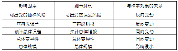 注冊會計師在細(xì)節(jié)測試中確定的樣本規(guī)模受到以下因素的影響,如下表: