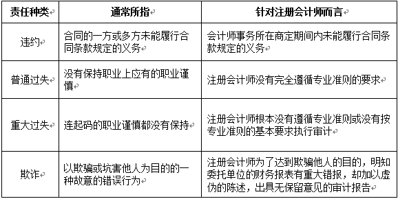 對注冊會計師法律責(zé)任可能被認(rèn)定為違約、過失和欺詐,其中,過失可按程度不同區(qū)分為普通過失和重大過失。如下表所示: