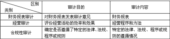 注冊(cè)會(huì)計(jì)師審計(jì)是一種有償?shù)奈袑徲?jì),按照接受委托目的和內(nèi)容,注冊(cè)會(huì)計(jì)師審計(jì)可分為財(cái)務(wù)報(bào)表審計(jì)、經(jīng)營(yíng)審計(jì)和合規(guī)性審計(jì),三者的區(qū)別見(jiàn)下表1-2。