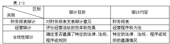 注冊(cè)會(huì)計(jì)師審計(jì)是一種有償?shù)奈袑徲?jì),按照接受委托目的和內(nèi)容,注冊(cè)會(huì)計(jì)師審計(jì)可分為財(cái)務(wù)報(bào)表審計(jì)、經(jīng)營(yíng)審計(jì)和合規(guī)性審計(jì),三者的區(qū)別見下表1-2。