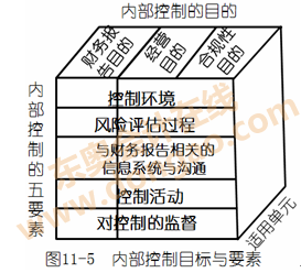 【相關(guān)說明1】根據(jù)審計(jì)準(zhǔn)則對(duì)內(nèi)部控制的定義,內(nèi)部控制的目標(biāo)和要素如圖11-5所示: