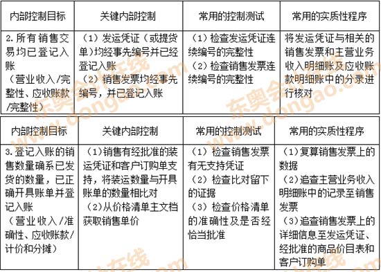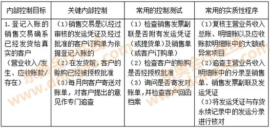 【知識點】:銷售交易的內(nèi)部控制目標(biāo)、關(guān)鍵內(nèi)部控制和審計測試一覽表