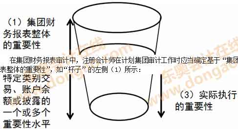 在集團財務報表審計中,注冊會計師在計劃集團審計工作時應當確定基于“集團財務報表整體的重要性”,如“杯子”的左側(cè)(1)所示: