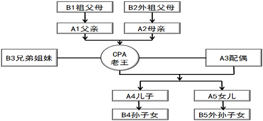 在是否對職業(yè)道德基本原則或獨(dú)立性產(chǎn)生不利影響的判斷中常常涉及到“近親屬”概念。同時(shí),針對不同類別的“近親屬”,其防范措施也是不同的。下面我們以ABC會計(jì)師事務(wù)所審計(jì)項(xiàng)目組成員CPA“老王”為例,結(jié)合注冊會計(jì)師實(shí)務(wù)操作,把CPA“老王”的“近親屬”分為主要近親屬(用A表示)和其他近親屬(用B表示),如下圖所示: