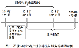 如圖6所示,如果會計師事務(wù)所在2013年1月1日至2013年3月1日期間為其審計客戶提供了不被允許的非鑒證服務(wù),將對獨立性產(chǎn)生不利影響。