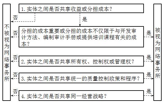 如果構(gòu)成“聯(lián)合體”的實(shí)體之間分擔(dān)的成本重要,或分擔(dān)的成本不僅限于與開發(fā)審計(jì)方法、編制審計(jì)手冊或提供培訓(xùn)課程有關(guān)的成本,則被視為網(wǎng)絡(luò)事務(wù)所;反之,如果構(gòu)成“聯(lián)合體”的實(shí)體之間分擔(dān)的成本不重要,或分擔(dān)的成本僅限于與開發(fā)審計(jì)方法、編制審計(jì)手冊或提供培訓(xùn)課程有關(guān)的成本,則不被視為網(wǎng)絡(luò)事務(wù)所。