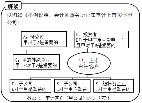 母公司是指直接或間接控制被審計(jì)單位的實(shí)體,且當(dāng)被審計(jì)單位對(duì)其重要時(shí),該母公司應(yīng)當(dāng)被包含在審計(jì)客戶的定義中,即圖22-4中的A公司。