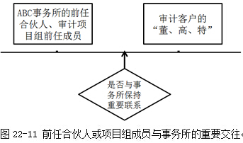 審計(jì)項(xiàng)目組前任成員或會(huì)計(jì)師事務(wù)所前任合伙人加入審計(jì)客戶,擔(dān)任董事、髙級管理人員或特定員工,必須杜絕與事務(wù)所的重要交往,包括一切經(jīng)濟(jì)利益關(guān)系。如圖22-11所示: