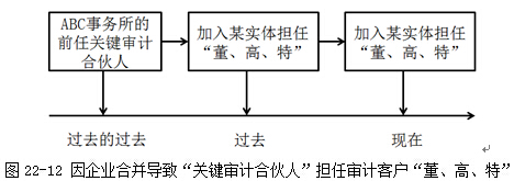 因企業(yè)合并,會(huì)計(jì)師事務(wù)所前任“關(guān)鍵審計(jì)合伙人”擔(dān)任屬于公眾利益實(shí)體的審計(jì)客戶的“董、高、特”,如圖22-12所示: