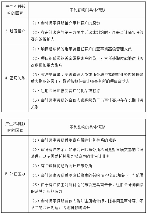 對(duì)職業(yè)道德基本原則產(chǎn)生不利影響的有自身利益、自我評(píng)價(jià)、過(guò)度推介、密切關(guān)系和外在壓力五種典型的情形。