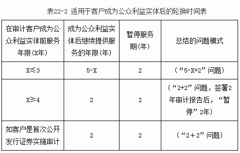 根據(jù)定期輪換要求,關(guān)鍵審計(jì)合伙人在審計(jì)客戶(hù)成為公眾利益實(shí)體后的輪換時(shí)間,如表22-2所示:
