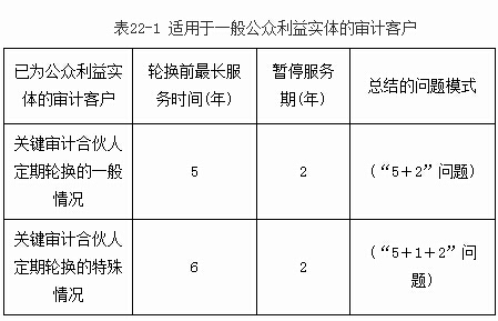 根據(jù)定期輪換要求,關(guān)鍵審計(jì)合伙人在一般公眾利益實(shí)體的審計(jì)客戶(hù)的輪換時(shí)間,如表22-1所示: