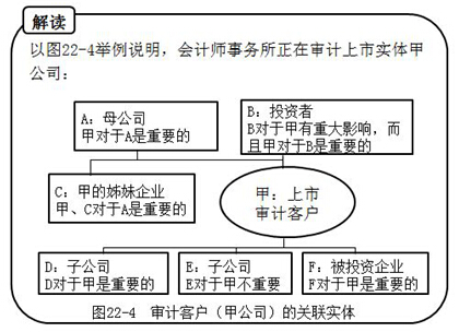 母公司是指直接或間接控制被審計單位的實體,且當(dāng)被審計單位對其重要時,該母公司應(yīng)當(dāng)被包含在審計客戶的定義中,即圖22-4中的A公司。
