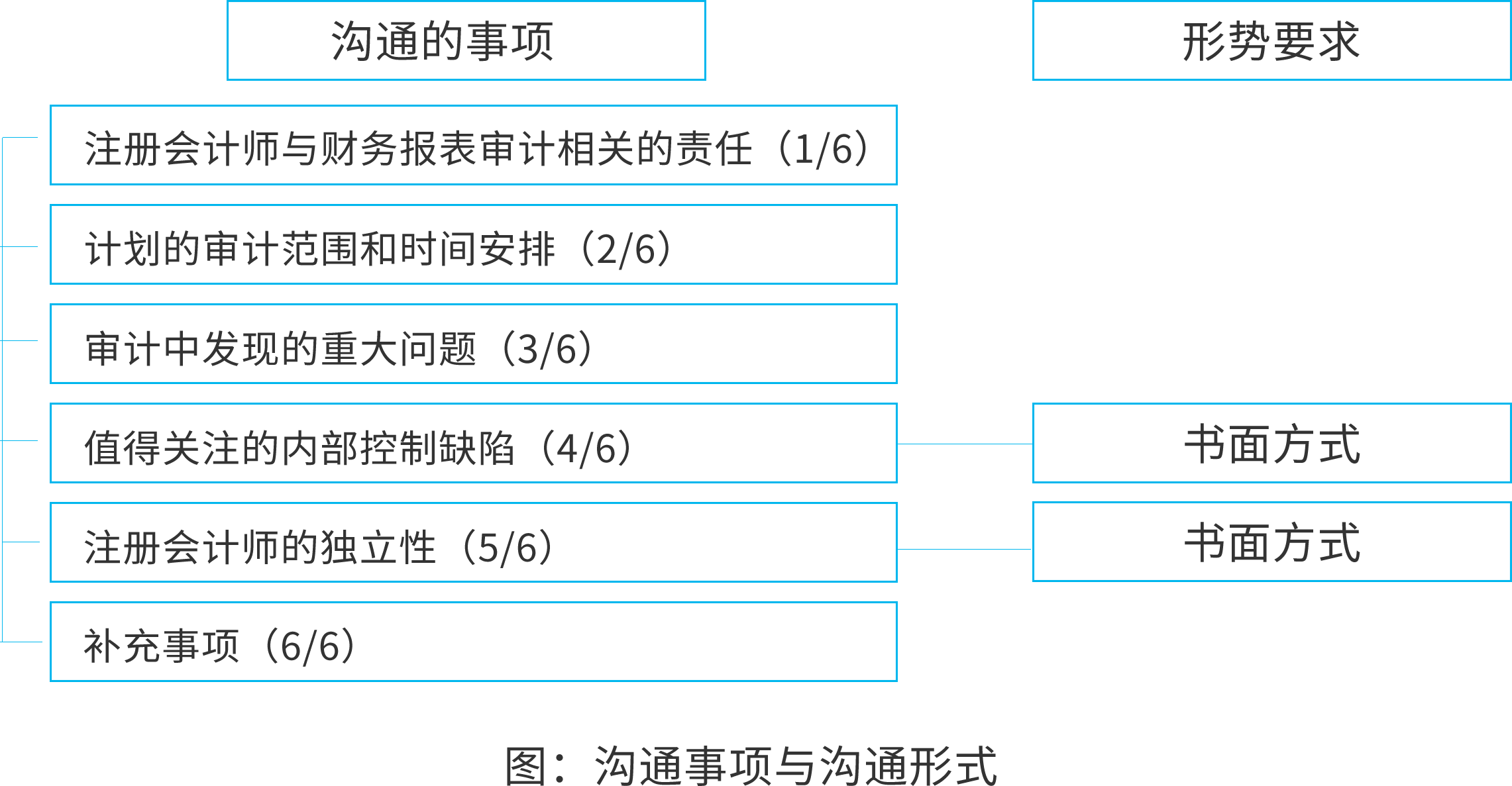 審計準(zhǔn)則明確規(guī)范了注冊會計師與治理層的溝通事項(xiàng)(六個方面)與溝通形式(書面或口頭),如圖所示。