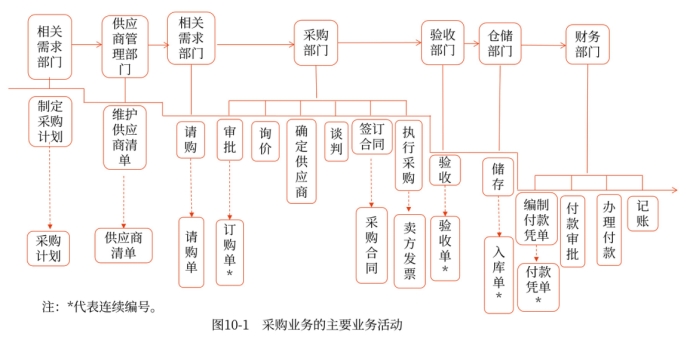 本章以一般制造業(yè)企業(yè)為例,說明采購業(yè)務(wù)的主要業(yè)務(wù)活動,如圖10-1所示。
