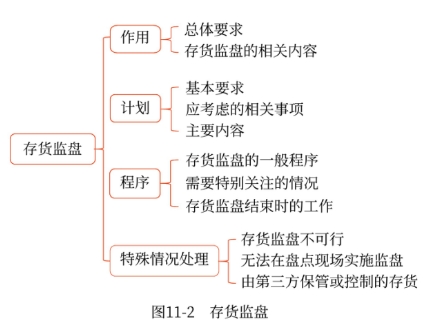 存貨監(jiān)盤的內(nèi)容包括存貨監(jiān)盤的作用、計(jì)劃、程序和特殊情況處理,如圖11-2所示。