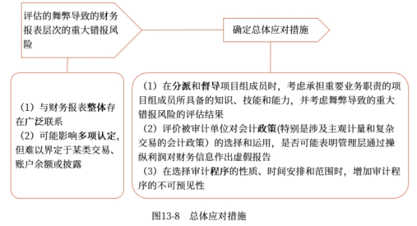 針對評估的舞弊導(dǎo)致的財務(wù)報表層次重大錯報風險,注冊會計師確定的總體應(yīng)對措施,如圖13-8所示。