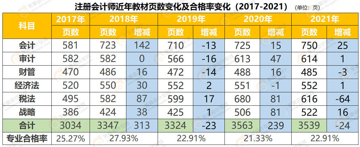 為了驗(yàn)證這種觀點(diǎn)是否正確,我們對(duì)官方公布的近年教材頁(yè)數(shù)增加和注冊(cè)會(huì)計(jì)師考試專業(yè)階段合格率綜合分析,制作出以下表格。