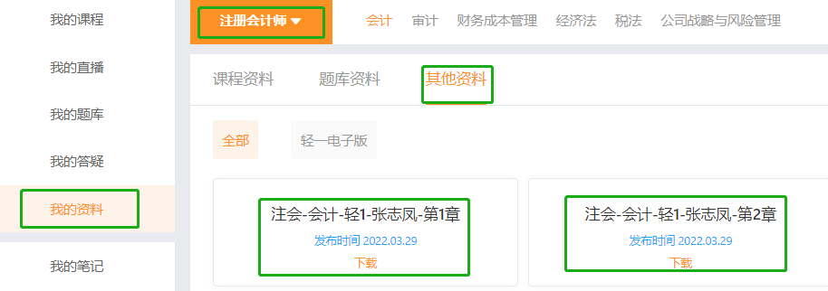 ■ 步驟二:選擇“注冊會計師”考種,點擊側(cè)邊欄“我的資料”欄目,選擇“其他資料”選項,即可下載《輕一》電子版內(nèi)容!