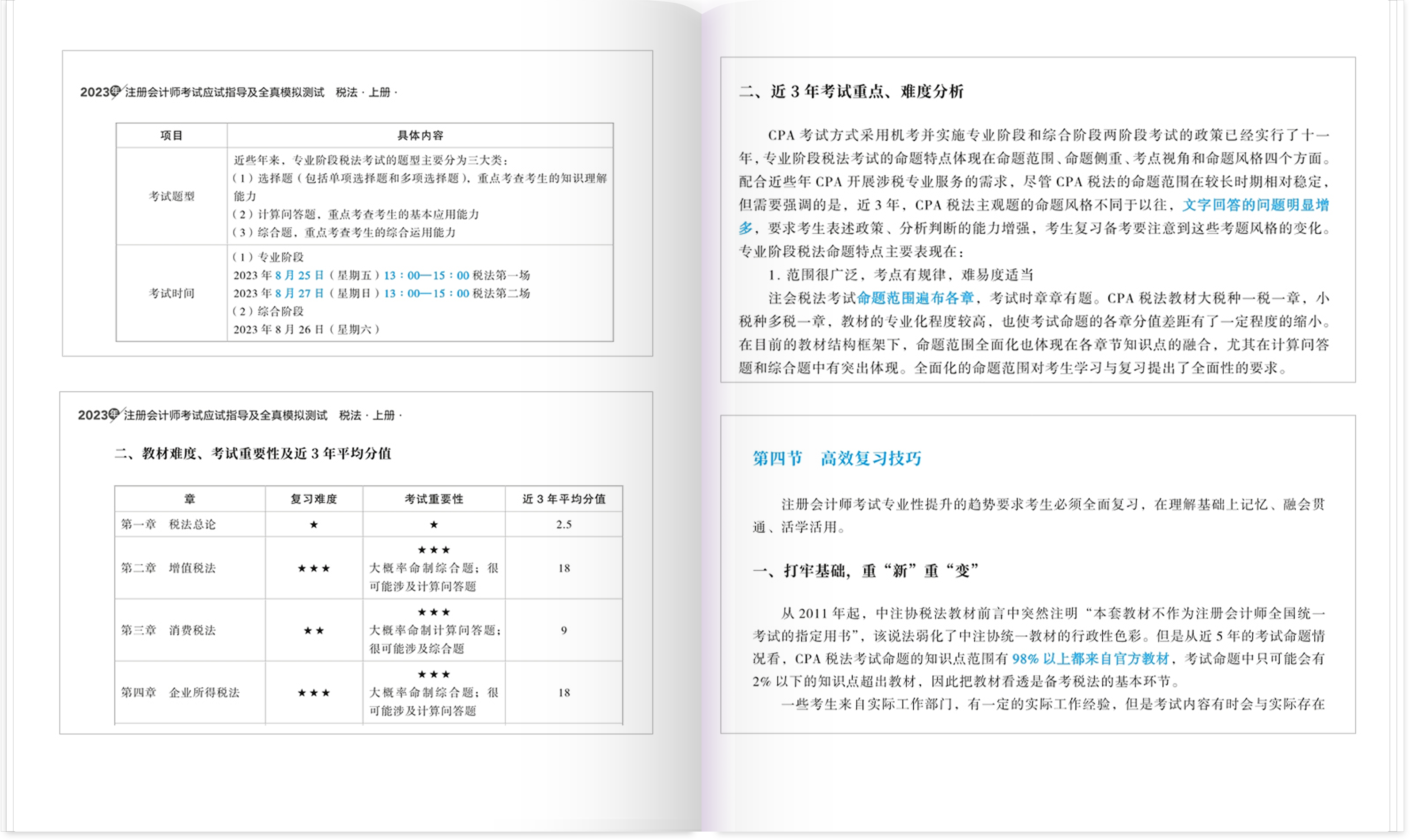 在這一部分,考試政策會(huì)告訴你,考試時(shí)間、題型,知識(shí)掌握程度等基本考情,教材基本情況會(huì)讓你了解教材各章節(jié)的難度、考試重要性和近3年的平均分值,命題規(guī)律總結(jié)會(huì)給出答題規(guī)范、難度分析、規(guī)律預(yù)測(cè)等,這些會(huì)加深你對(duì)考試的理解,復(fù)習(xí)技巧會(huì)教你“向哪個(gè)方向,怎么用力”才能把注會(huì)考試“這艘船”成功駛向?qū)Π丁?/p>