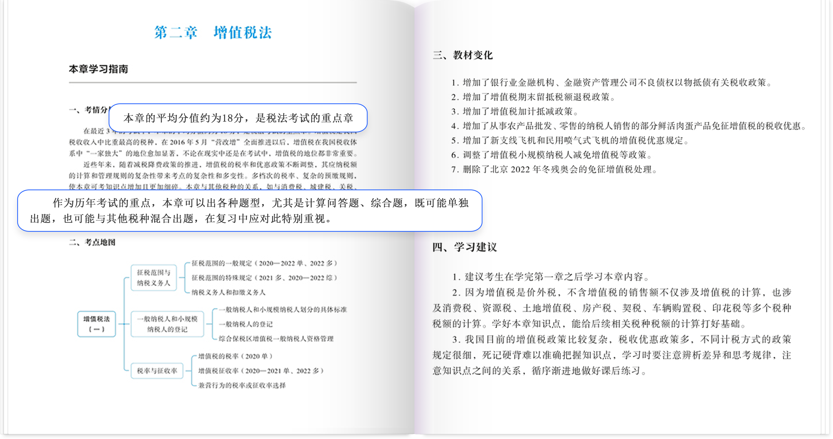 我們以第二章增值稅的學(xué)習(xí)為例,講解怎樣使用第二部分。當(dāng)你翻到P59,首先映入你眼簾的并不是“增值稅”考點(diǎn)的詳細(xì)講解,而是本章學(xué)習(xí)指南。