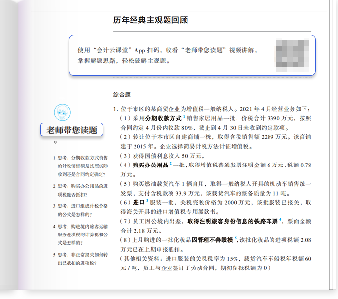 《輕一》將歷年考試中涉及該章節(jié)考點(diǎn)的主觀題也編入書(shū)中,全章知識(shí)學(xué)完后,可搭配解釋區(qū)的引導(dǎo)和掃碼視頻講解,了解往年的真題是如何考查的,掌握出題思路和方向。