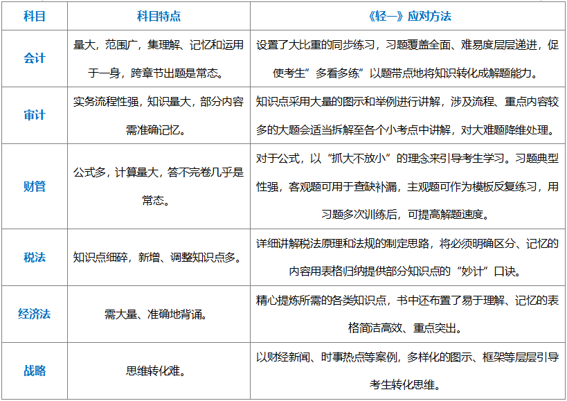 能夠順利通過(guò)考試,說(shuō)明你經(jīng)過(guò)了刻苦學(xué)習(xí),掌握了適合自己的學(xué)習(xí)方法。但注會(huì)六科特點(diǎn)不同,《輕一》針對(duì)其也給出了不同的應(yīng)對(duì)方法。在新一輪考試中,希望你能運(yùn)用好《輕一》,結(jié)合各科目的特點(diǎn)順利備考。點(diǎn)擊下方圖片,查看清晰大圖。