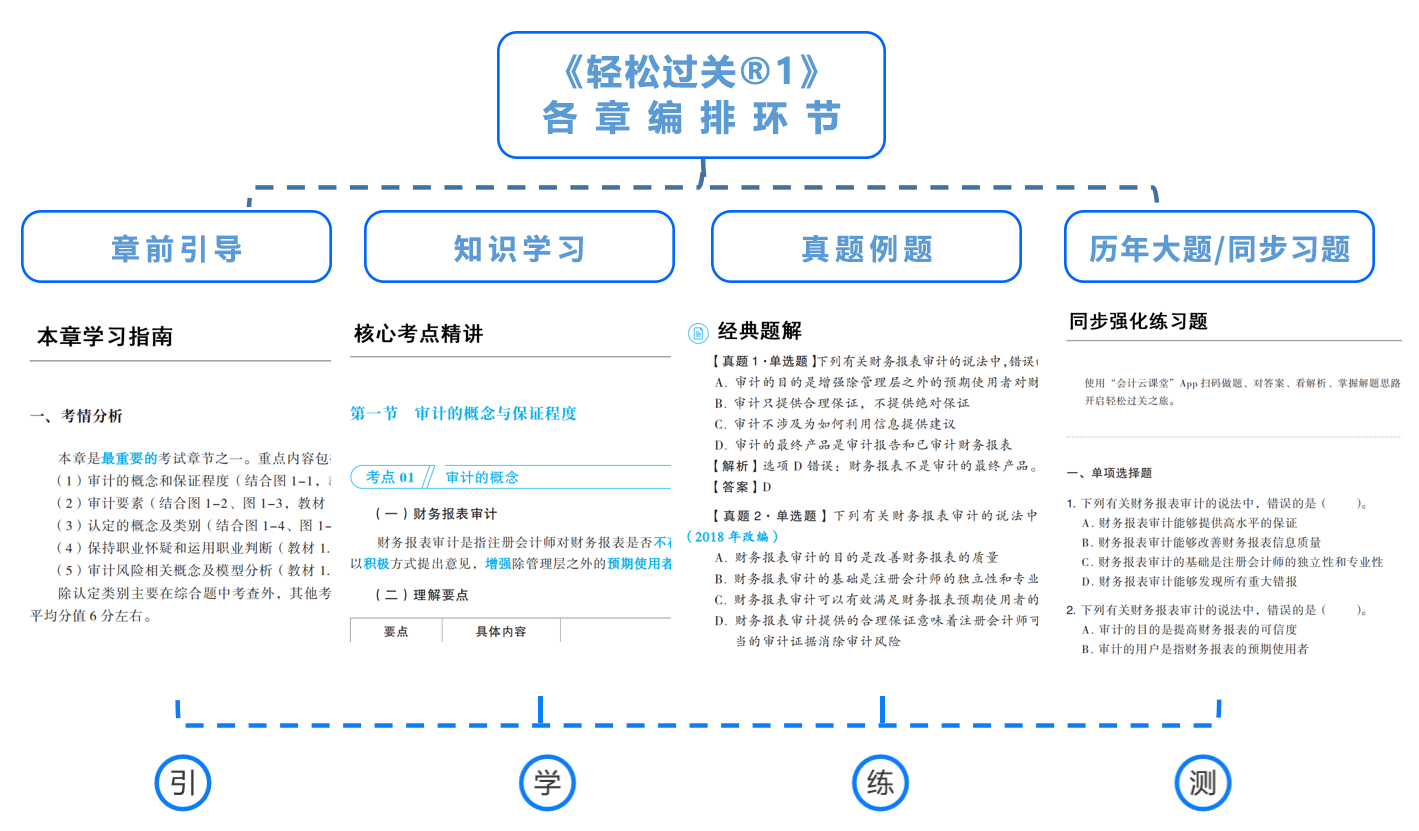 2023注會(huì)《輕一》主體可分成四個(gè)模塊,完全可以實(shí)現(xiàn)一套書(shū),多項(xiàng)用途的學(xué)習(xí)作用,模塊之間關(guān)聯(lián)合作,能夠充分發(fā)揮“入門(mén)-基礎(chǔ)-強(qiáng)化-沖刺”全階段的備考功能。