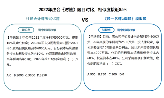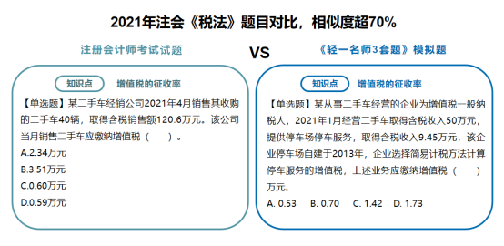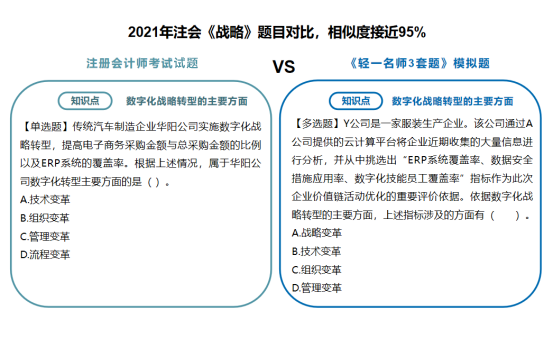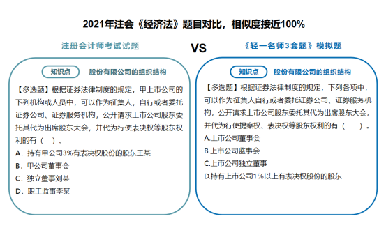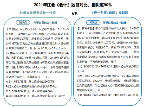 類似這樣的相似題型和同一考點模擬演練的例子多年來不勝枚舉?!遁p一名師3套題》的編題老師們始終掌握著行業(yè)知識的前沿政策、時政變化的新趨勢。自編模擬題非常符合注會“考試體制”。之所以沒有在編寫《輕一》時同步編排《輕一名師3套題》而是后續(xù)編擬在考前單獨、免費郵寄給考生,是因為隨著備考時間的推移,隨著考試時間的臨近,一些關(guān)鍵性的信息與政策才慢慢展現(xiàn)出來,有著20+年教培經(jīng)驗的東奧名師們,會與時俱進(jìn),隨時調(diào)整出題思路,在考前再為考生“收集”更多的考試風(fēng)向,幫助考生及時補充考點考核維度,讓考生們所練的習(xí)題更具代表性,更具應(yīng)試實踐性。