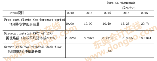 201 2年初,L集團(tuán)與H集團(tuán)的談判仍在進(jìn)行中。此時(shí),某投行聽說(shuō)L集團(tuán)有意尋求收購(gòu)歐洲的機(jī)械制造企業(yè),便找到L集團(tuán)在歐洲的投資顧問(wèn)B先生(一位英國(guó)人),向其推薦了Y公司,并提供了下列現(xiàn)金流量預(yù)測(cè)以及估值數(shù)據(jù),供L集團(tuán)參考。Y公司為一家上市公司,截至2011年12月30日Y公司收盤股價(jià)15歐元/股,總股數(shù)為1千萬(wàn)股。2011年末凈負(fù)債為3千萬(wàn)歐元。