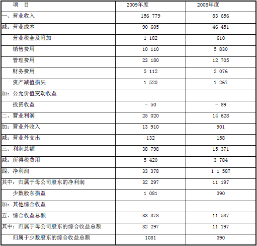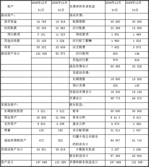 亞新公司2009年度合并資產(chǎn)負(fù)債表和合并利潤表以及部分財(cái)務(wù)報表項(xiàng)目的明細(xì)資料如下(其中:2008年度財(cái)務(wù)數(shù)據(jù)已經(jīng)海天會計(jì)師事務(wù)所審計(jì),2009年度財(cái)務(wù)數(shù)據(jù)尚未審計(jì)):