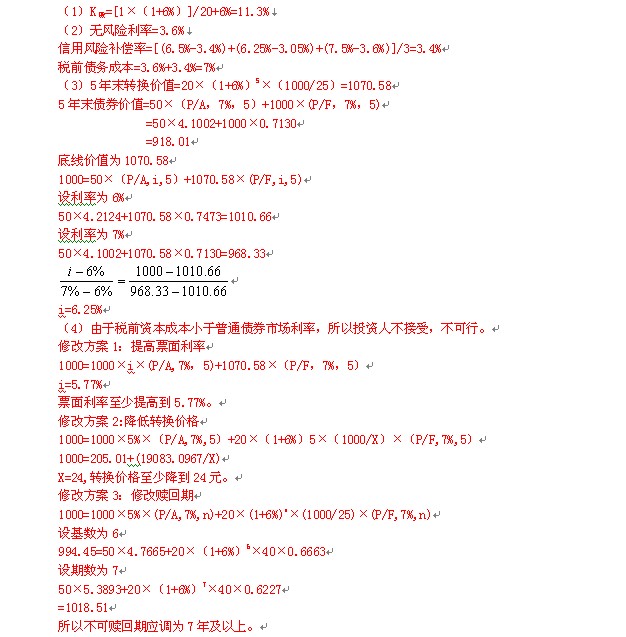 (3)根據(jù)方案3,計(jì)算第5年末可轉(zhuǎn)換債券的底線價(jià)值,并計(jì)算按廣安發(fā)行可轉(zhuǎn)換債券的稅前資本成本。